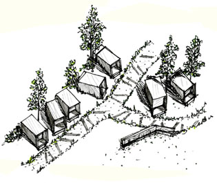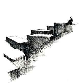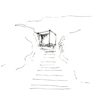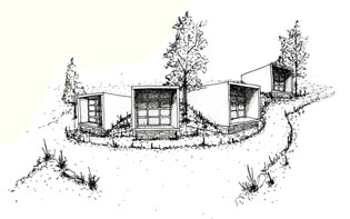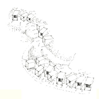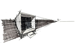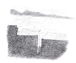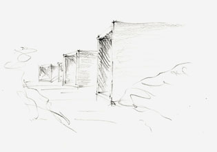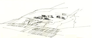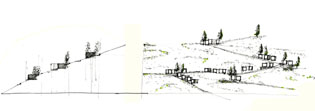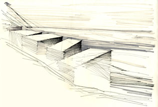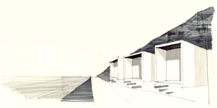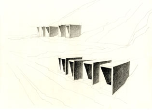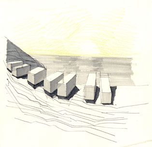 E1_CEMENTERIO FINISTERRE Sorprendió que una operación tan elemental como disponer una serie de “cubos” sobre un lugar, de indudable valor, pudiese dar tanto juego y, al inicio, plantease tantas preguntas gráficas. El primer gesto, incipiente, fue entender el asentamiento en sección, relacionando dos temas (la posición de los módulos respecto al perfil del terreno, y su apariencia lejana y frontal desde el mar), hecho que ponía en relación dos asuntos de una sola cuestión (la visión desde el mar y la visión hacia el mar). En ocasiones el gesto fue rápido y violento, casi como el pensamiento, ello puede verse en ejercicios como los de Clara Badia: consideramos que debíamos incentivar la expresión libre, tras aclarar cómo podían controlarse las fugas. Al final pudo entenderse que se debía simplificar, entender que la línea del horizonte es la altura de los ojos, y que la posición del cuerpo determinará la pertinencia de usar representaciones frontales (con un solo punto de fuga) o a tres cuartos (con dos puntos de fuga). Y los mejores resultados fueron los más sintéticos.