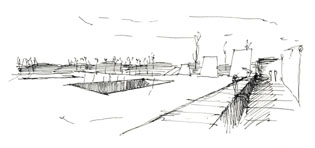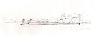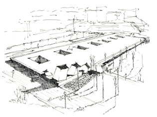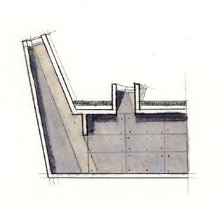 E3_TANATORIO DE LEÓN La experiencia del tanatorio de León ofreció otras conclusiones. Prácticamente ningún estudiante se cuidó de la relación del edificio con el contexto, un hecho relevante ya que la ubicación de un tanatorio en una zona residencial no era una empresa fácil para el diseñador, de aquí la inteligencia de la propuesta: la lámina de agua sobre su cubierta opera como un espejo, desvirtuando la mirada hacia su interior, puesto que el conjunto adquiere la apariencia de una intervención paisajista con una entrada en talud abierta hacia los caminos que bordean el río. Dada su longitud puede entenderse que las secciones no fueran exitosas, a pesar de la insistencia de los profesores en que el conjunto se dividiese en tres sectores a los efectos de explicar la sección. Echamos en falta asuntos como este a debatir la sutileza de la representación, que debiera ser un asunto compartido por todas las materias que tienen por objeto materializar una idea y comunicarla. Queremos decir con ello que una breve descripción del conjunto habría ayudado a comprender mejor la propuesta arquitectónica y hubiera constituido un buen inicio para explicar el edificio.
