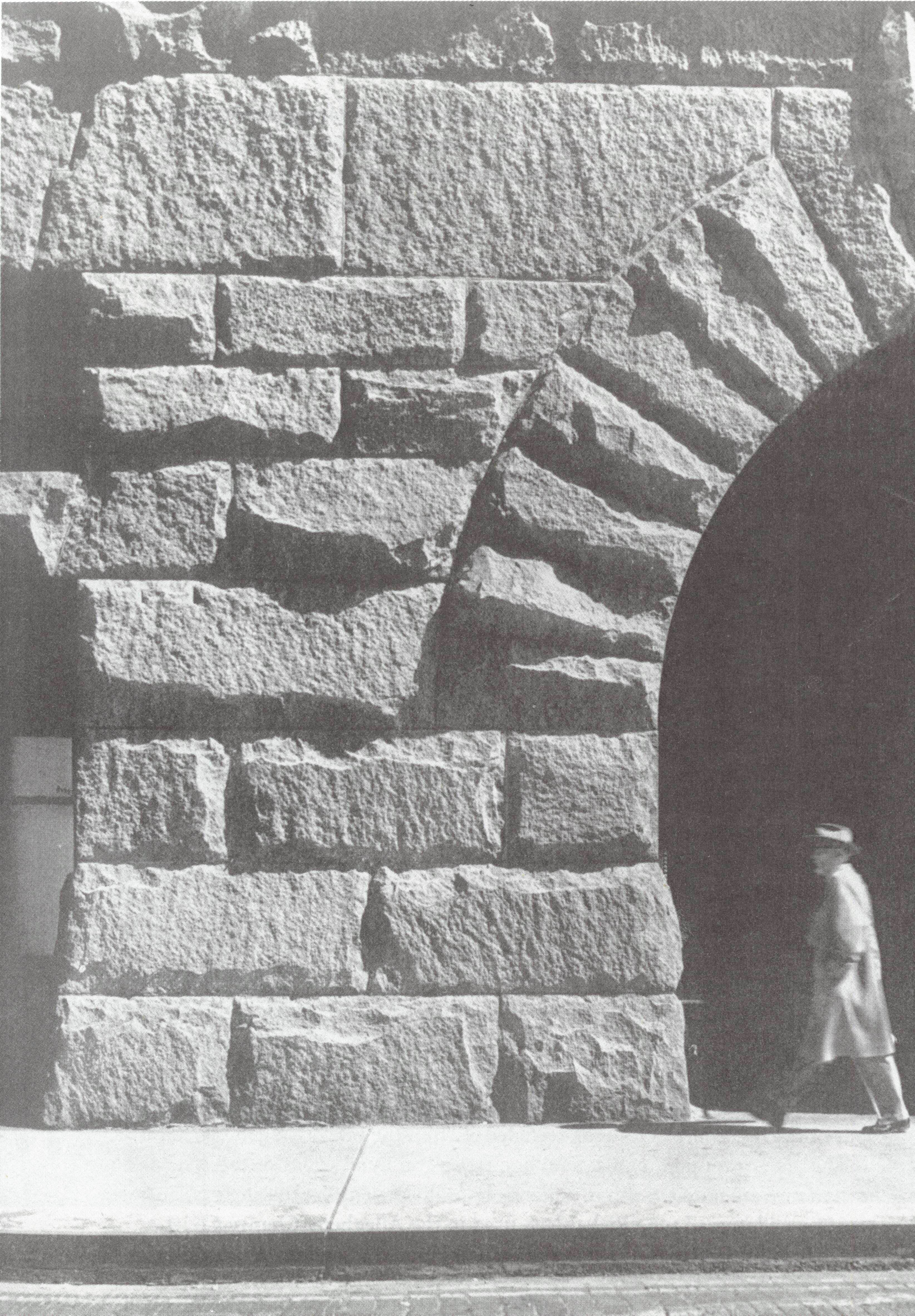 “...Els diversos elements estructurals que envolten a la gran porta... estan superposats com ornaments i com estructura. Tenen moltes contigüitats redundants i retòriques d’una classe d’ornament que està “sobre” l’estructura(...) Les mènsules o els sortints que disminueixen la llum, són suggerides per les diagonals de les cantonades superiors de l’obertura. L’exagerada clau està superposada sobre l’arc rebaixat, el dintell i el timpà de l’arc. A les seves relacions complexes aquests elements són a la vegada en graus diferents, estructurals i ornamentals, sovint redundants i alguns cops reminiscents. A la combinació quasi igual d’horitzontals, verticals, diagonals i corbes, es corresponen amb els marcs superposats al voltant de la finestra d’ull de bou de l’edifici en forma cúbica del Merchant’s National Bank...”