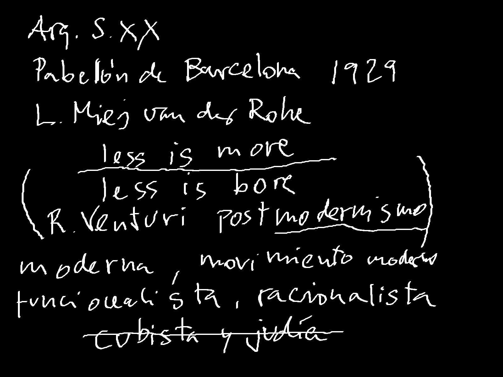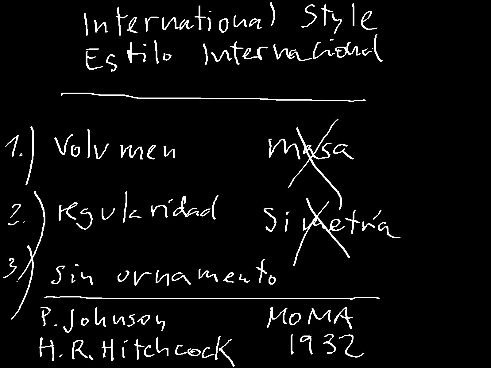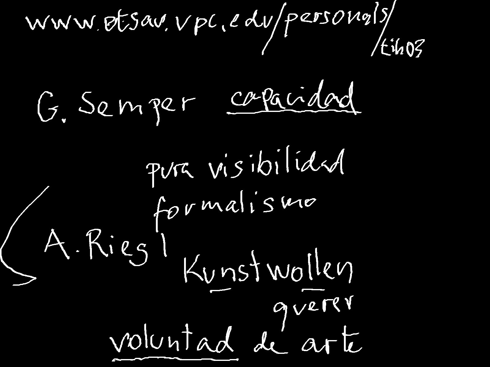 Mitjans del s. XIX – G. Semper – Teoria: Les formes artístiques evolucionen perquè evoluciona la tècnica, els materials..... Crítics formalistes – A. Riegl - Posen en dubte la teoria de G. Semper. L’evolució de l’art no és el poder fer (materials, etc...) sinó el voler fer. Kunstwollen (kunst = art, wollen = voler), és a dir, voluntat d’art.Pablo Picasso no és que sigui sapastre sinó que vol ser sapastre (en referència als seus quadres imperfectes) Arquitectura del s. XX Pavelló de Barcelona , Mies Van der Rohe (1929) – “Less is more” (menys és més). Uns altres diuen “Less is bore” (menys és avorrit). “No acceptem problemes de forma, només de construcció”R. Venturi – post modernisme – contrari al modernisme, noves tendències “No volem parets de càrrega, estructures sobre pilars, cobertes planes, és a dir, no volem l’arquitectura de “Le Corbussier” o de “Mies Van der Rohe” dels anys 20, volem una arquitectura cubista i jueva” Arquitectura modernista, moviment modernista, funcionalisme, racionalisme són sinònims del mateixInternational Style (l’estil internacional) Aquest estil substitueix la massa pel volum, la simetria per la regularitat i fa una arquitectura sense ornamentació.Exemples |